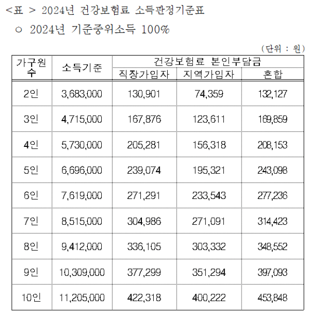 <2024년 건강보험료 소득판정기준표 & 기준중위소득 100%>